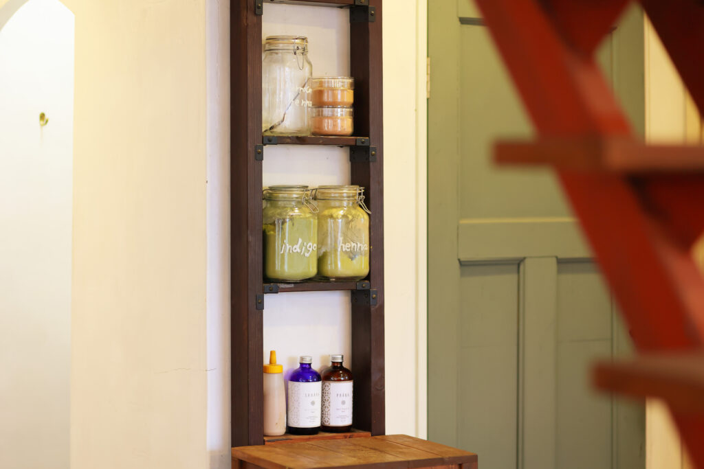 入り口すぐ横にヘナと各種ハーブ類、オーガニックオイル。